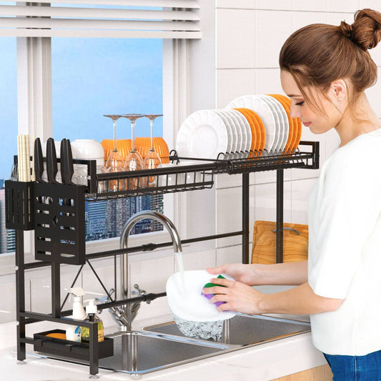 Over The Sink Dish Drying Rack, 2 Tiers Stainless Steel Dish Racks For Kitchen Counter, Large Dish Drainer With Utensil Holder, Cutting Board Holder, Kitchen Drying Rack-Black